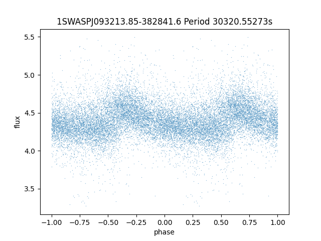 | 1SWASPJ093213.85-382841.6 | 13.39 | 30320.55273 ~ |