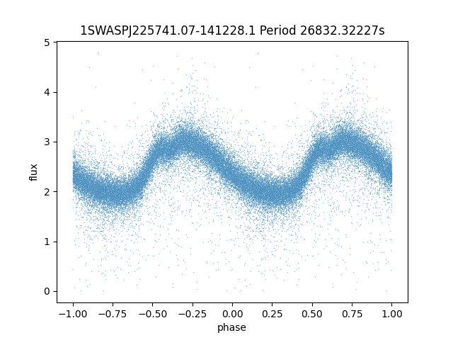 | 1SWASPJ225741.07-141228.1 | 14.04 | 26832.32227 ~ |