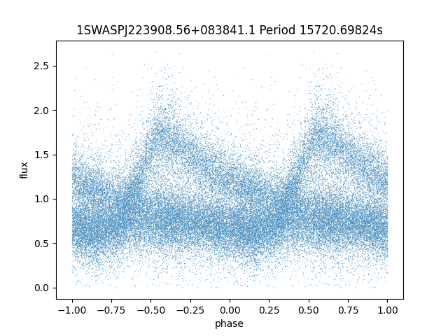 | 1SWASPJ223908.56+083841.1 | 15.07 | 15720.69824 ~ |