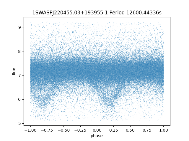 | 1SWASPJ220455.03+193955.1 | 12.87 | 12600.44336 ~ |