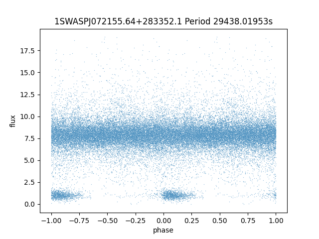 | SuperWASP ID | Mean Magnitude | Period (seconds) | Majority Classification | Folding flag | RA | Dec | Lightcurve |