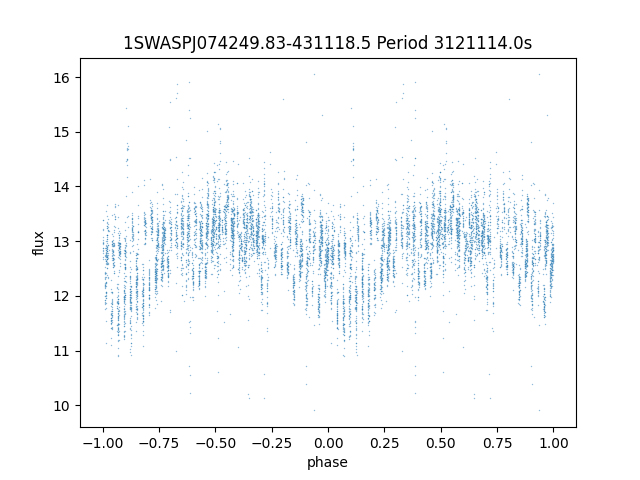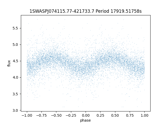 | 1SWASPJ074115.77-421733.7 | 13.38 | 17919.51758 ~ |